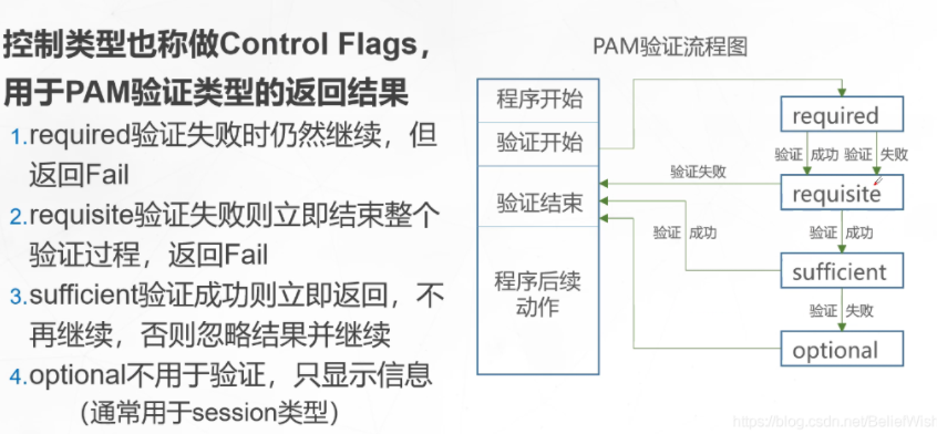 第一列代表PAM认证模块类型 auth: 对用户身份进行识别,如提示输入密码,判断是否为root。 account: 对账号各项属性进行检查,如是否允许登录系统,帐号是否已经过期,是否达到最大用户数等。 password: 使用用户信息,用户数据的打开和关闭,挂载文件系统。