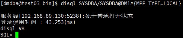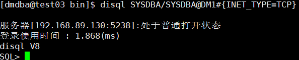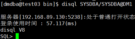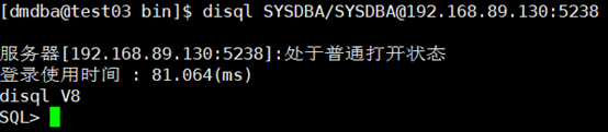 用户名/密码@主机名或主机IP:端口号连接: disql SYSDBA/SYSDBA@192.168.89.130:5238 ? 在dm_svc.conf中添加connect_identifier: DM1=(192.168.89.130:5238) 用户名/密码@connect_identifier连接