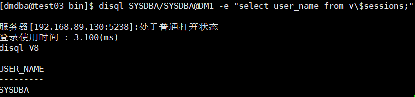 使用-e 参数,将在运行 DIsql 时直接执行后续的一条或多条 SQL 语句(语句用分号分隔),查询结果不显示行号、时间以及影响行数,且不受-C 参数控制 disql SYSDBA/SYSDBA@DM1 -e "select user_name from v\$sessions;"