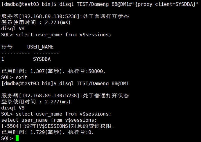 #使用代理用户test登录被代理用户sysdba: disql TEST/Dameng_88@DM1#"{proxy_client=SYSDBA}"