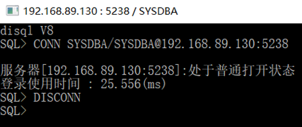 在 DIsql 界面中,使用 CONN[ECT]命令登录远程数据库 DISCONNECT断开连接 使用客户端disql连接数据库 CONN SYSDBA/SYSDBA@192.168.89.130:5238 ? ? ? |