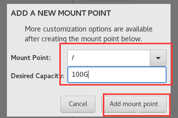 - ?自定义/boot分区,点击+号,选择挂载点和设置文件大小,点击Add mount point? ? ? ? ? ? ? ? ? ? ? ? ??