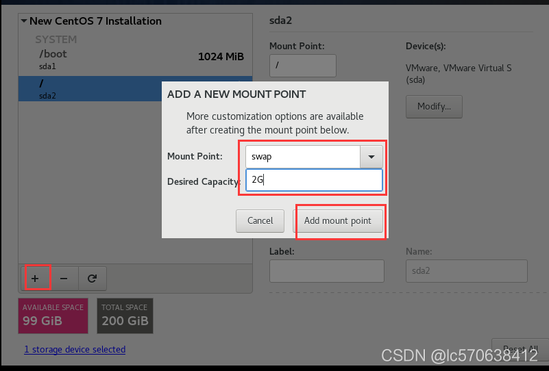 - ?自定义swap分区,点击+号,选择挂载点和设置文件大小,点击Add mount point