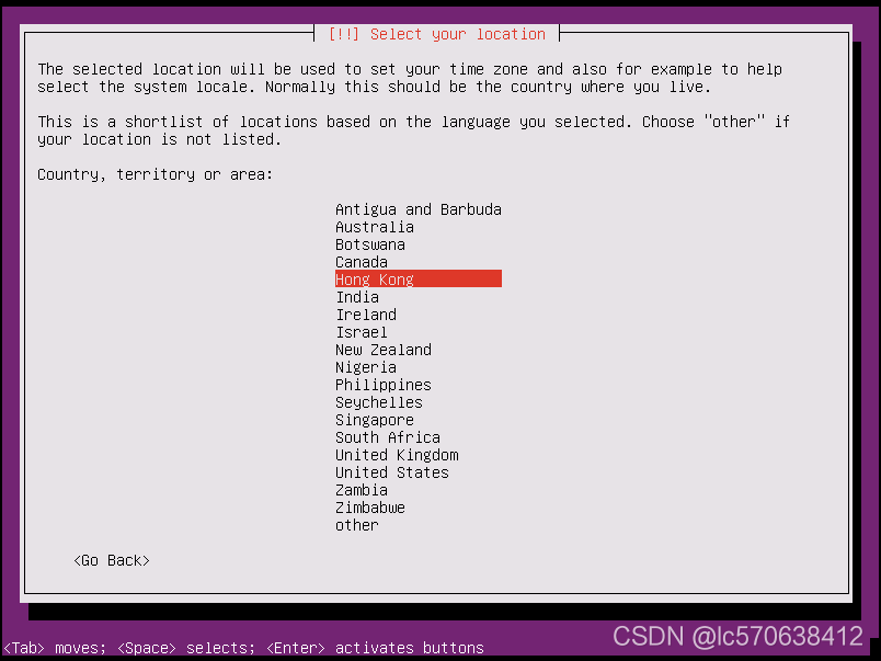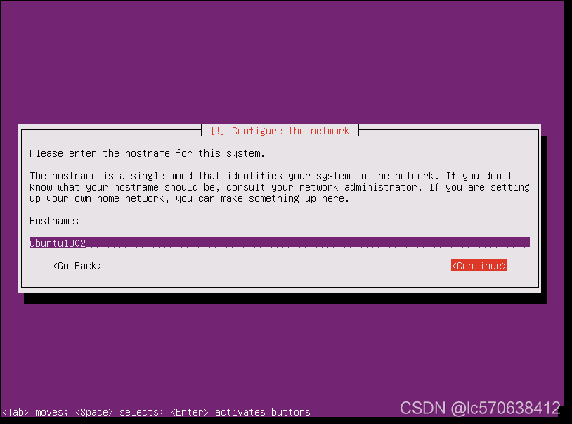 - ?配置主机名(hostname),输入主机名,选择Continue,回车