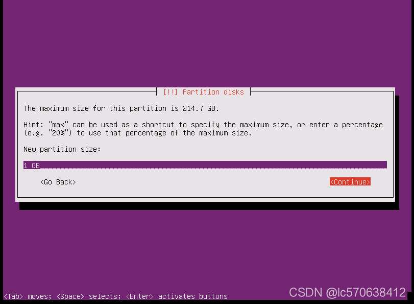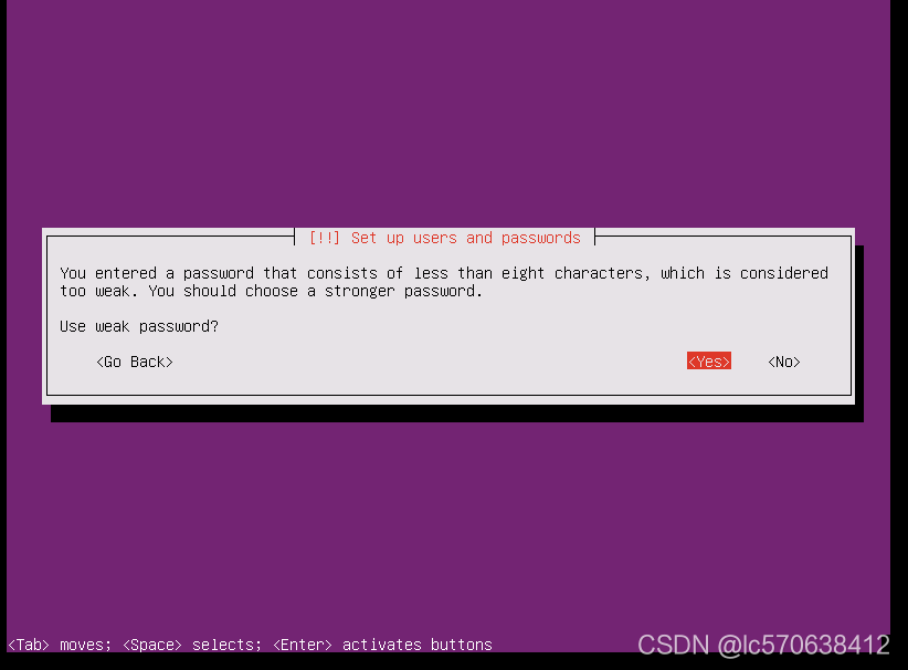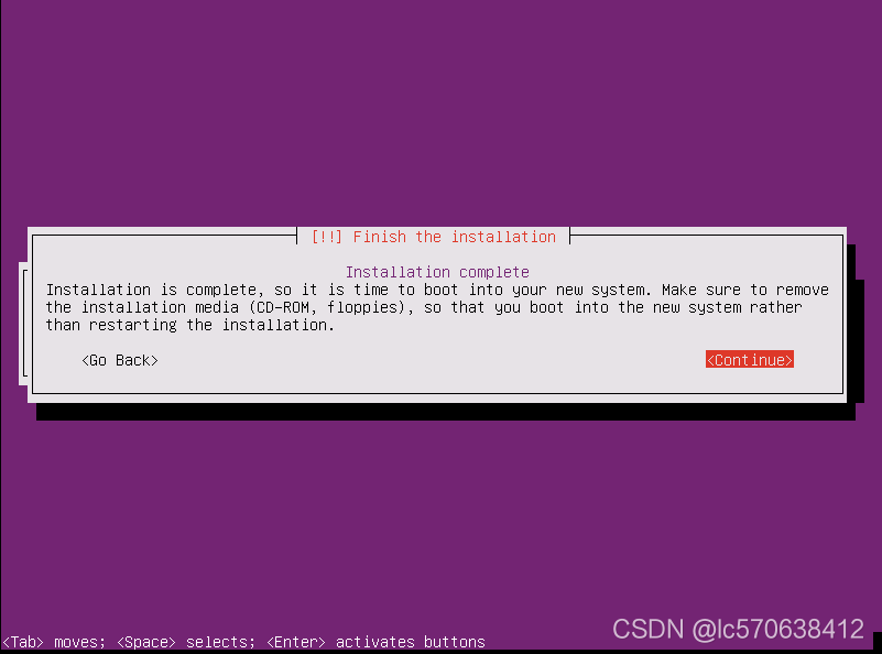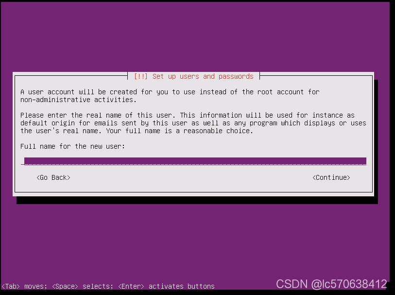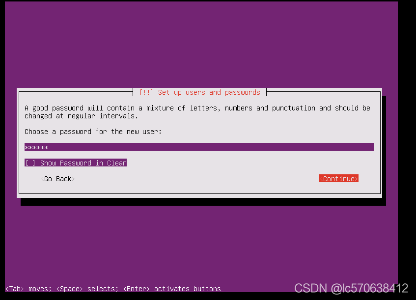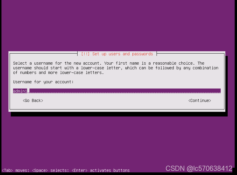 - ?建立用户和设置密码,输入用户名,选择Continue,回车