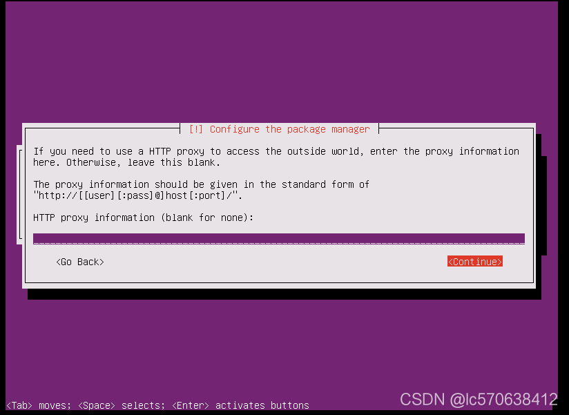 - ?根据环境判定是否需要配置代理,需要代理则输入地址,然后选择Continue,回车,否者直接选择Continue,回车