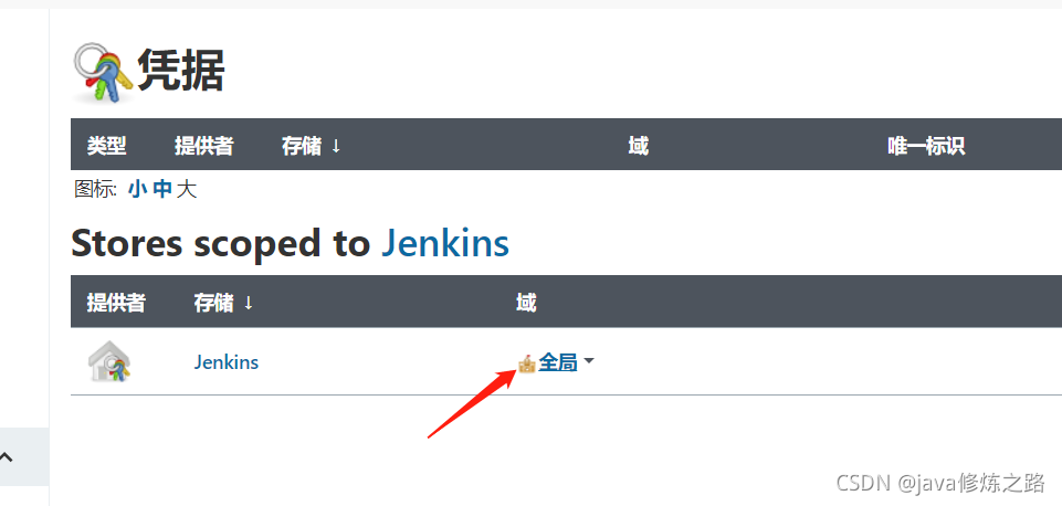 1.创建用户名密码凭证  点击全局,然后点击左侧的添加凭据   ID不需要填写会自动生成