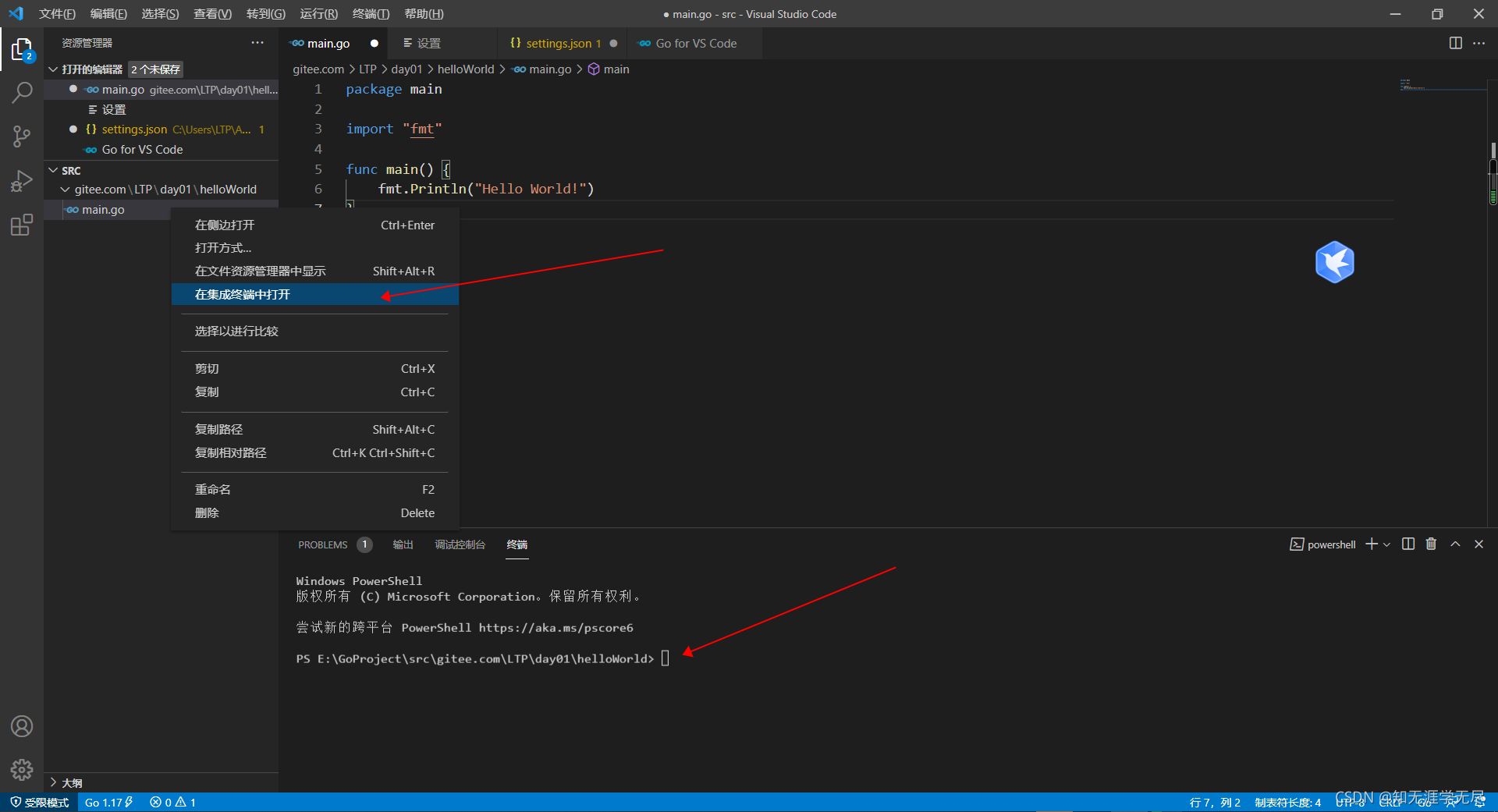 右键点击"在终端中打开",然后使用“go build”命令进行编译  -