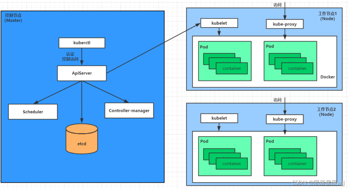 一个kubernetes集群主要是由控制节点(master)、工作节点(node)构成,每个节点上都会安装不同的组件。