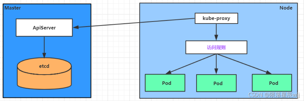 Service在很多情况下只是一个概念,真正起作用的其实是kube-proxy服务进程,每个Node节点上都运行着一个kube-proxy服务进程。当创建Service的时候会通过api-server向etcd写入创建的service的信息,而kube-proxy会基于监听的机制发现这种Service的变动,然后它会将最新的Service信息转换成对应的访问规则。