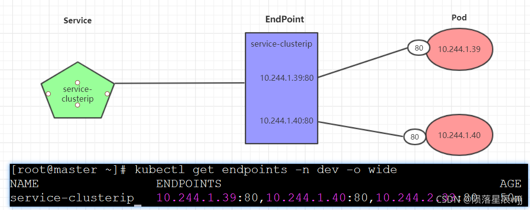 一个Service由一组Pod组成,这些Pod通过Endpoints暴露出来,Endpoints是实现实际服务的端点集合。换句话说,service和pod之间的联系是通过endpoints实现的。