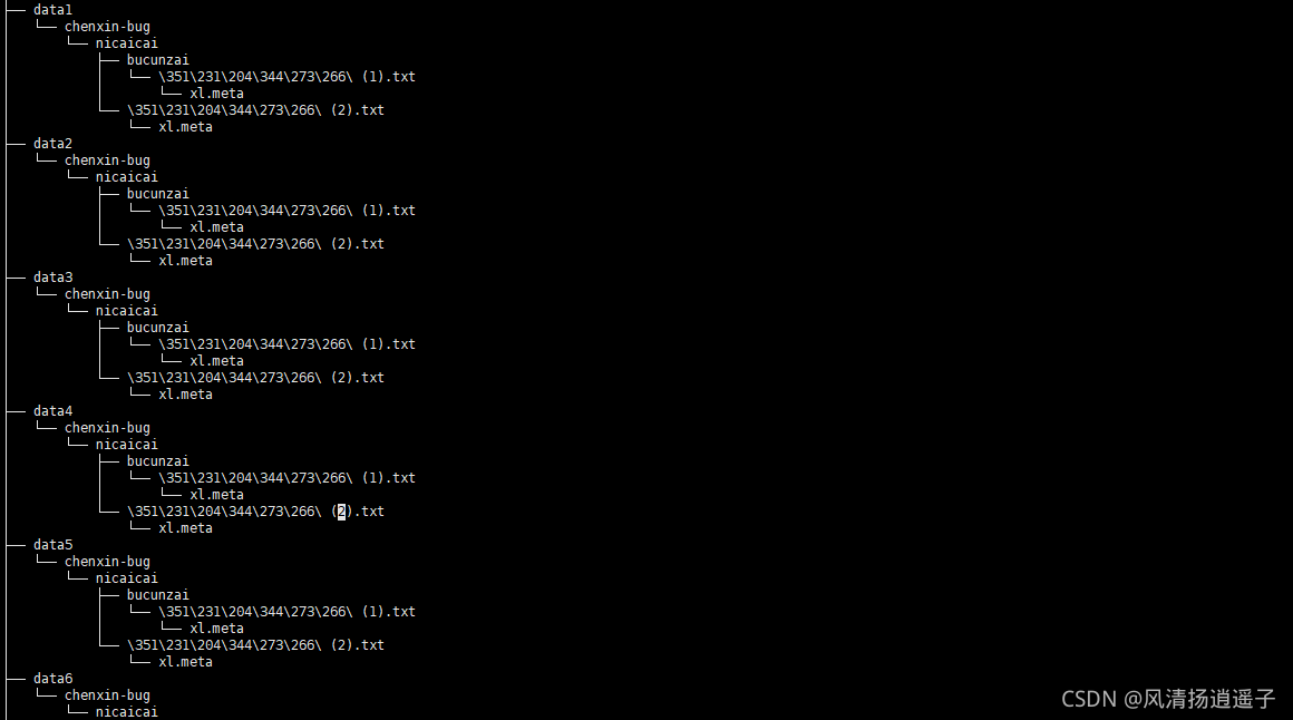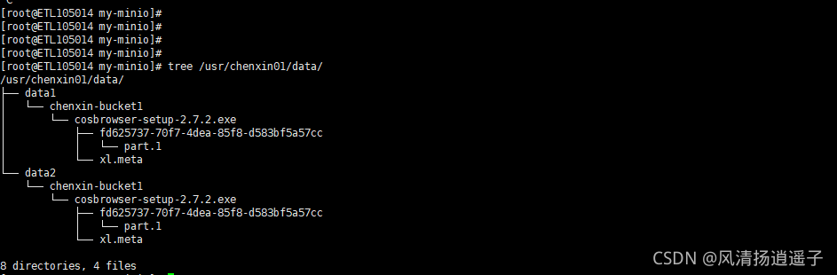 ????????文件对象上传到 MinIO后,会在对应的数据存储磁盘中,以 Bucket 名称为目录,文件名称为下一级目录,目录下有 xl.meta是元数据文件。