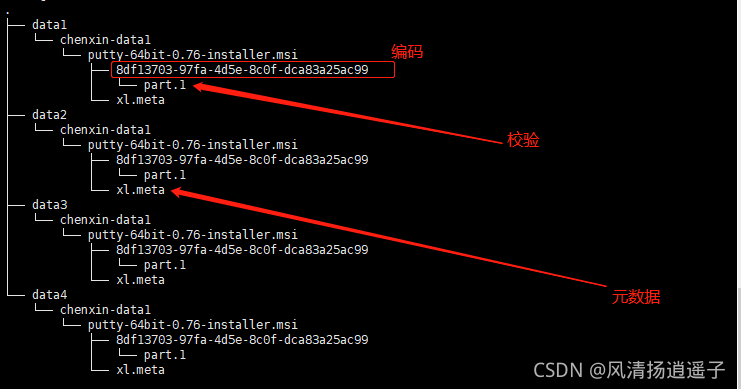 ? ? ? ? 如果这个文件是大于1M,以文件名称为下一级目录,文件名下是 part.1 和 xl.meta,前者是编码数据块及检验块,后者是元数据文件。