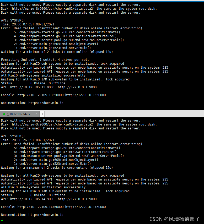 nohup /usr/chenxin/my-minio/minio server --console-address ":50000" http://10.12.105.13/usr/chenxin01/data/data1 http://10.12.105.13/usr/chenxin01/data/data2 \