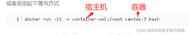 docker run -it --mount source=container-vol,target=/root centos:7 bash 简写? docker run -it? -v??container-vol :/root? centos:7 bash