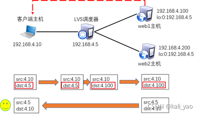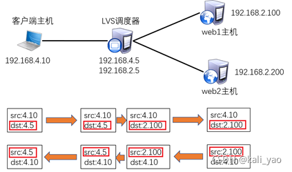 LVS NAT实验请求数据包从LVS调度器进,web的相应数据包也从LVS调度器出,那么LVS调度器就需要承载所有数据的压力,会成为整个集群的瓶颈!!