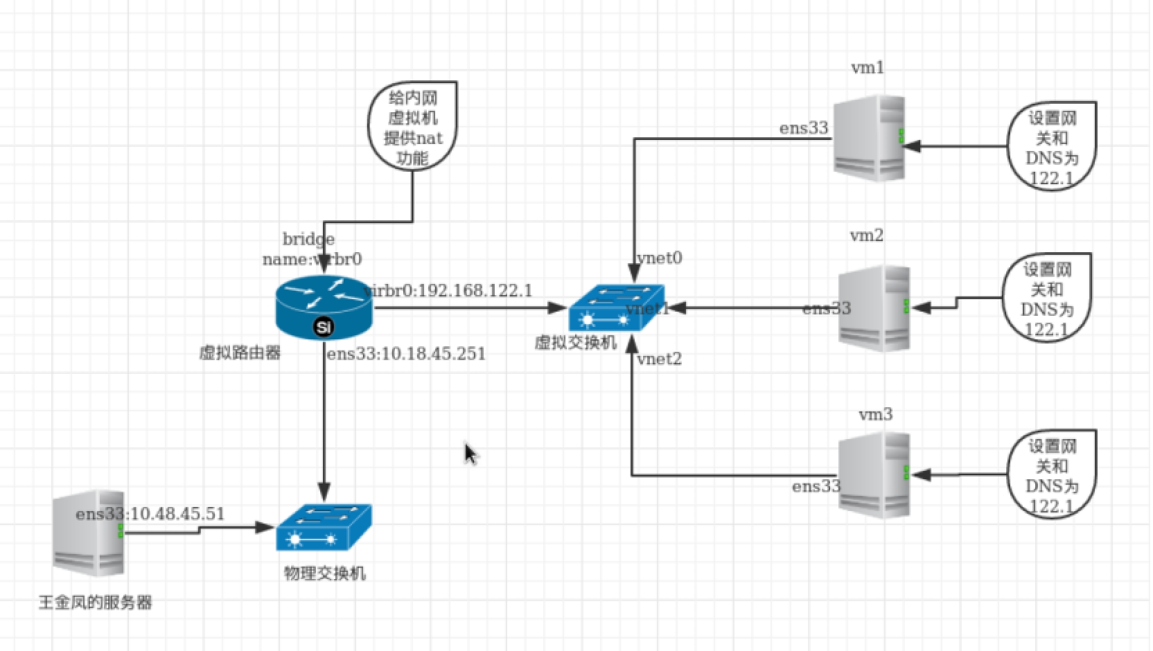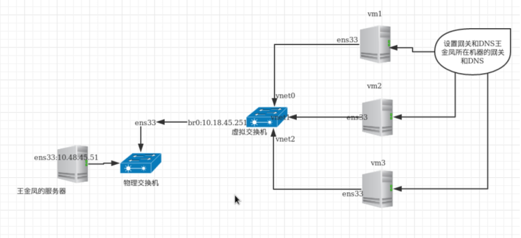 技术:现在虚拟机上做个桥接口,物理网卡接到桥接口,桥接口连接虚拟交换机