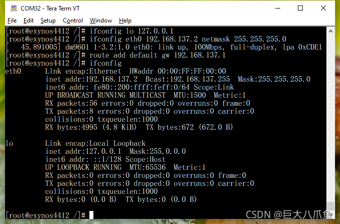 现在再执行ifconfig命令,就能看到eth0和lo两个网络接口了。 lo是本地回环接口,IP地址为127.0.0.1(localhost)。 eth0就是DM9621A网口,IP地址为192.168.137.2,子网掩码为255.255.255.0,默认网关为192.168.137.1(路由器的IP地址)。