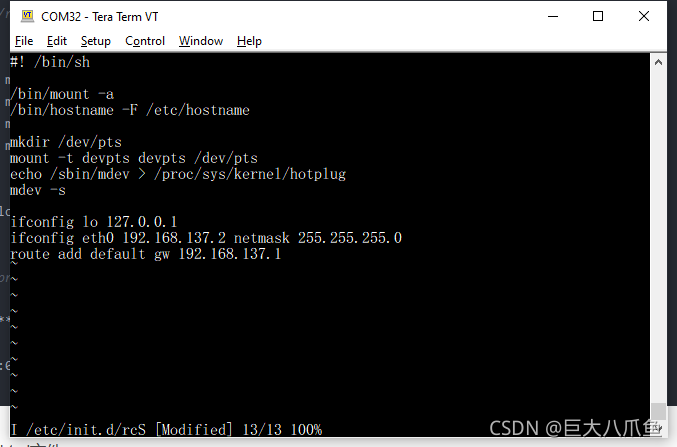 这下就能ping通百度了,wget也能成功下载网页,保存为index.html文件。 为了使IP地址永久生效,关机后也不会丢失,我们把之前那三条命令加入到/etc/init.d/rcS开机脚本中: