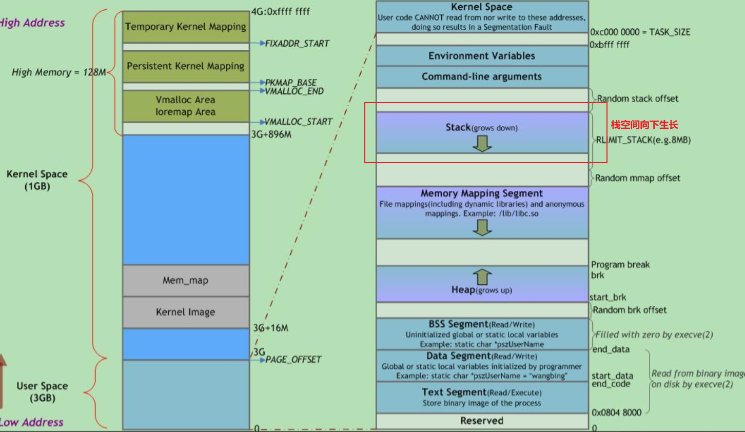 ? ????????持续地重用栈空间有助于使活跃的栈内存保持在CPU缓存中,从而加速访问。进程中的每个线程都有属于自己的栈。向栈中不断压入数据时,若超出其容量就会耗尽栈对应的内存区域,从而触发一个页错误。此时若栈的大小低于堆栈最大值RLIMIT_STACK(通常是8M),则栈会动态增长,程序继续运行。映射的栈区扩展到所需大小后,不再收缩。 ? ? ?Linux中ulimit -s命令可查看和设置堆栈最大值,当程序使用的堆栈超过该值时, 发生栈溢出(Stack Overflow),程序收到一个段错误(Segmentation Fault)。注意,调高堆栈容量可能会增加内存开销和启动时间。 ? ? ?堆栈既可向下增长(向内存低地址)也可向上增长, 这依赖于具体的实现。本文所述堆栈向下增长。 ? ? ?堆栈的大小在运行时由内核动态调整。 32位寄存器??