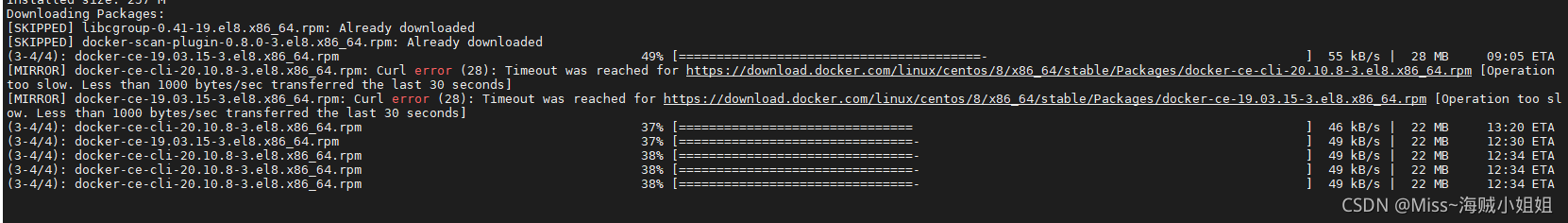 1. 下载docker-ce的repo curl https://download.docker.com/linux/centos/docker-ce.repo -o /etc/yum.repos.d/docker-ce.repo 2. 安装依赖 yum install https://download.docker.com/linux/fedora/30/x86_64/stable/Packages/containerd.io-1.2.6-3.3.fc30.x86_64.rpm 3. 安装docker-ce 问题:使用dnf -y ?install docker-ce ?docker-ce-cli --nobest命令安装会报错: ? ? https://download.docker.com/linux/centos/7/x86_64/stable/repodata/repomd.xml: [Errno 12] Timeout on https://download.docker.com/linux/centos/7/x86_64/stable/repodata/repomd.xml: (28, 'Operation timed out after 30002 milliseconds with 0 out of 0 bytes received') Trying other mirror.