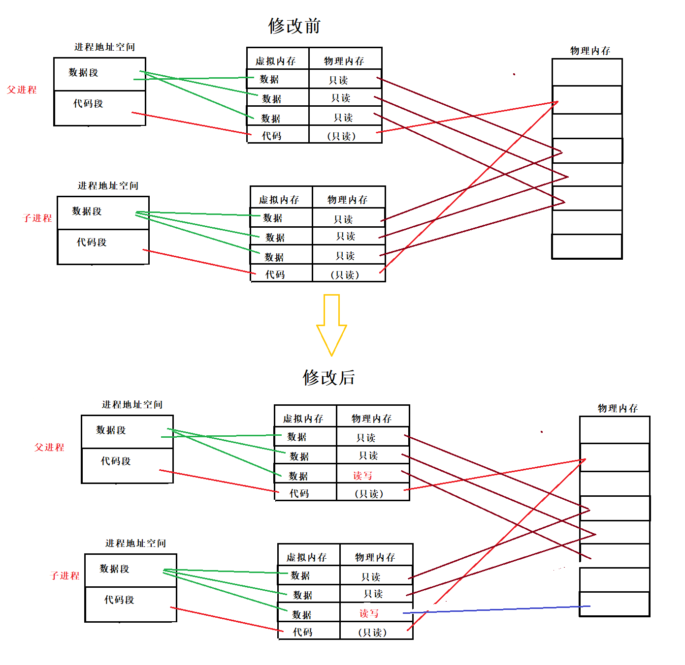 所谓写时拷贝,顾名思义,写的时候再进行拷贝。一开始fork的时候,实际上父子进程的数据也是共享,此时操作系统会将数据也变成只读的,一旦一方进行写入操作,那么操作系统就会发现这个错误,然后进行写时拷贝,只将需要拷贝的一小块数据分配到新的内存中。  可以看到,被修改的数据,父子进程的页表会改变只读权限,然后操作系统为子进程新选择一块内存,将它的数据映射过去,但是其他的数据保持不变!!