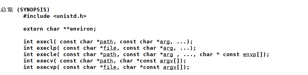 - path表示程序所在的路径。而file表示程序的名称。arg和argv都是是命令行参数,注意的是,需要NULL结尾。envp代表环境变量的指针数组。