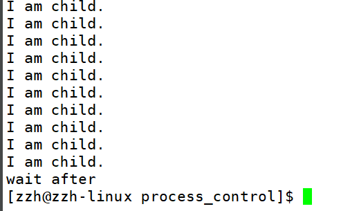 上述代码父进程阻塞等待子进程,结果就是子进程先打印10次,然后父进程等待成功,打印“wait after”。