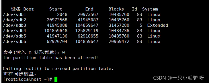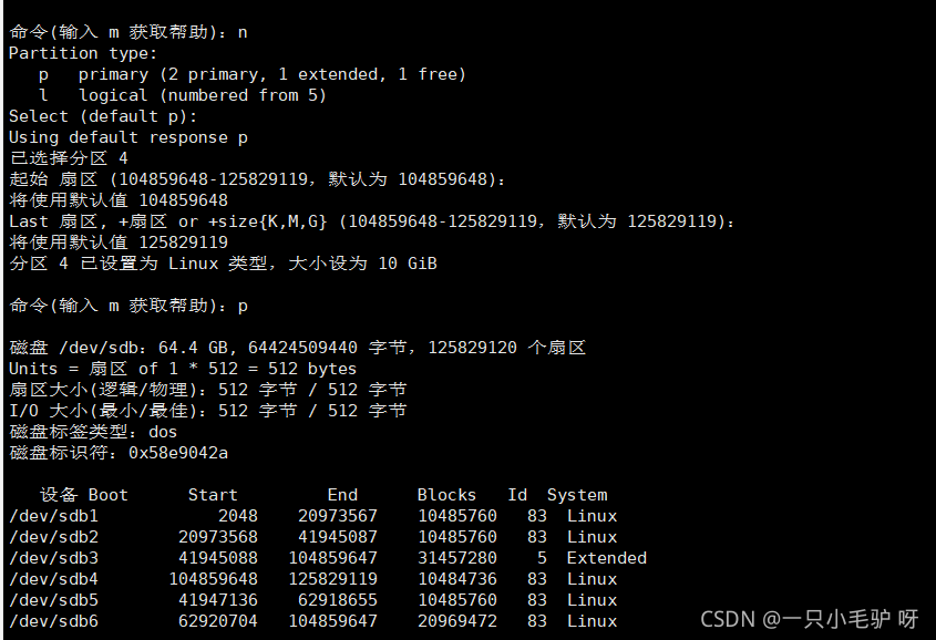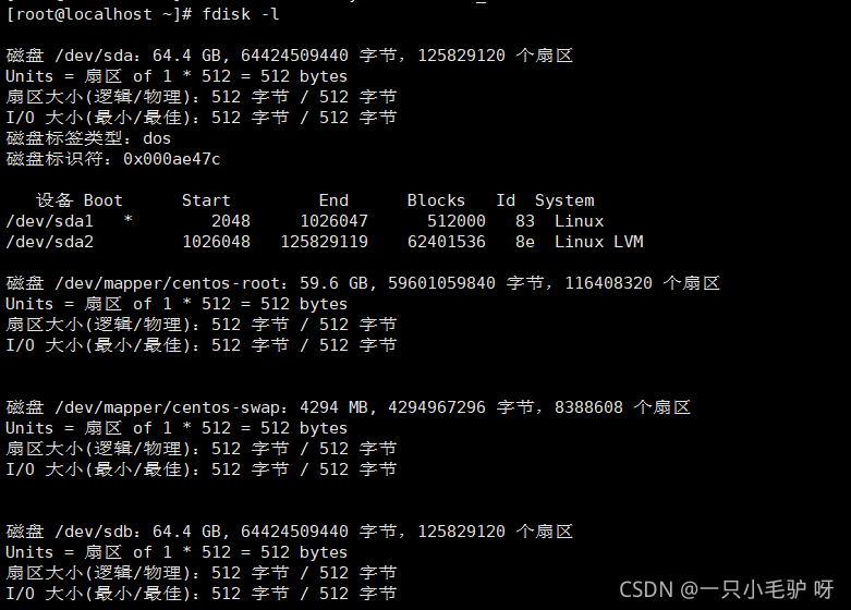 ?Device (设备) :分区的设备文件名称。 Boot:是否是引导分区。若是,则有"*"标识。 Start:该分区在硬盘中的起始位置(柱面数) End:该分区在硬盘中的结束位置(柱面数) Blocks:分区的大小,以Blocks (块)为单位,默认的块大小为1024字节。 Id:分区对应的系统 ID 号。例如,83表示Linux中的XFS分区或EXT4分区、82代表交换文件系统、8e表示LVM逻辑卷。 System:分区类型。