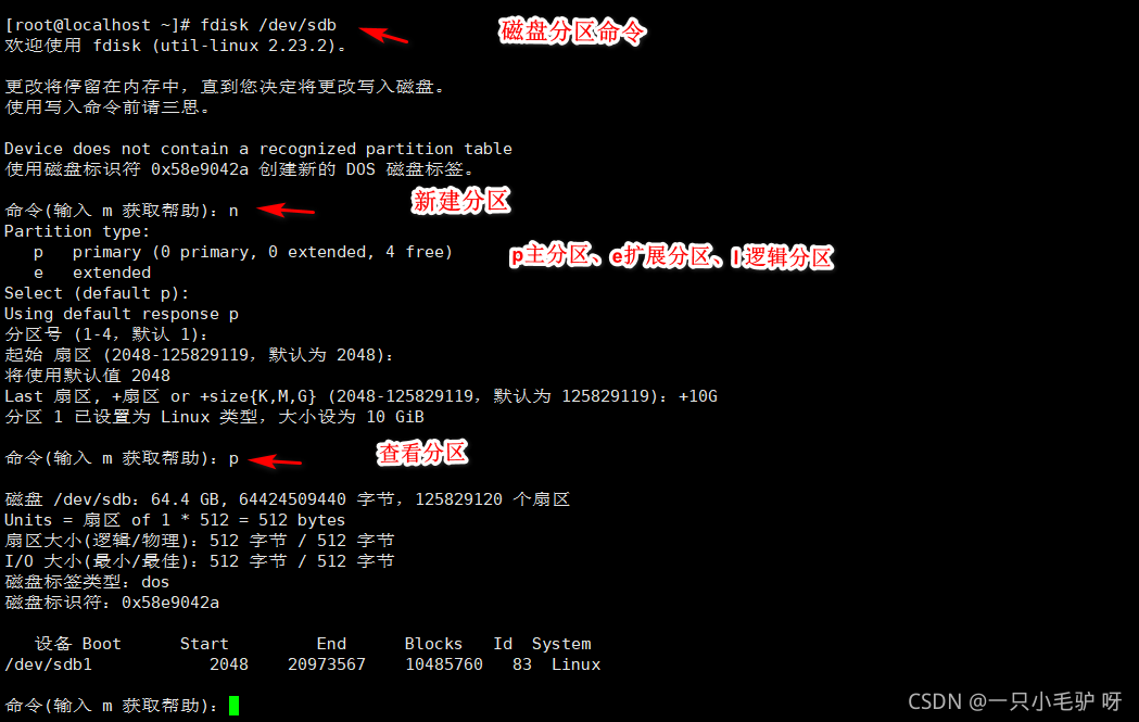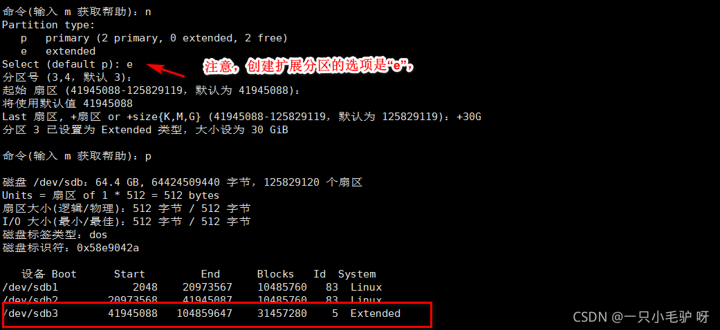 使用fdisk /dev/sda 进入交互模式