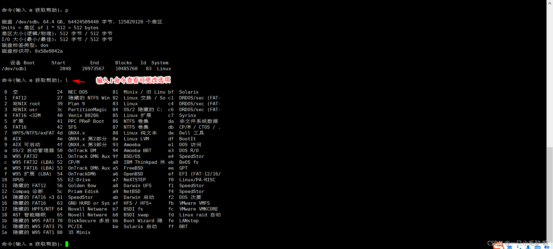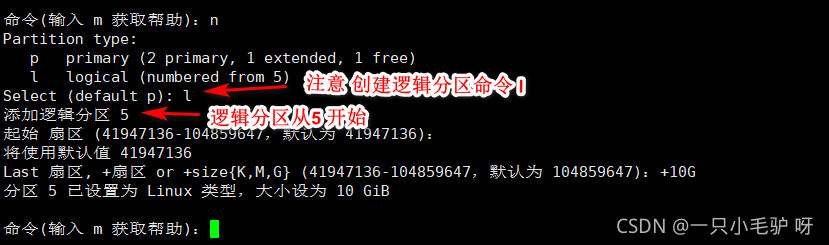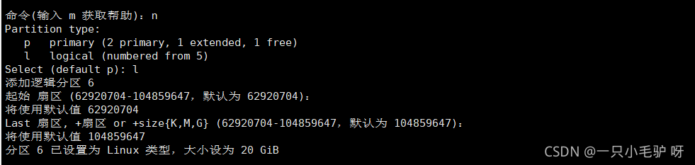 m、p、 n、 d、 t、 w、q m:获取帮助菜单 n:新建分区 p:查看分区情况 d:删除分区 t:变更分区的类型 w:保存分区操作并退出 q:不保存分区操作并退出