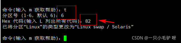 ??sdb6更改为swap系统,在创建swap之前,目标分区应先通过fdisk 工具将分区类型ID 号设为82。