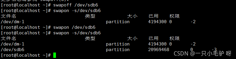 swapon /dev/sdb6? 启用新增加的交换分区 swapoff /dev/sdb6?停用指定的交换分区 swapon -s? ?查看每个分区的swap状态信息 free -m? ? ?查看总的swap状态信息