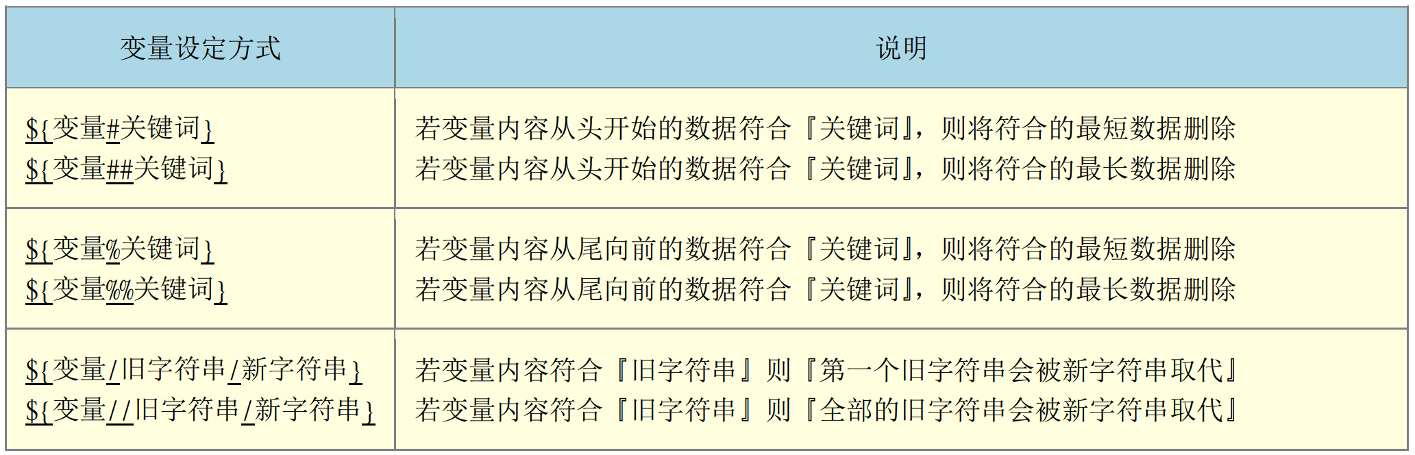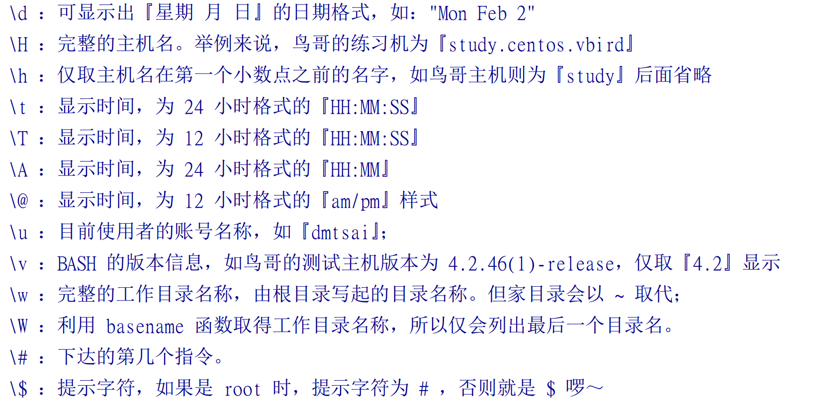 PS1:提示字符的设定  $:本shell的PID ?:关于上个执行指令的回传值 export:自定义变量转成环境变量