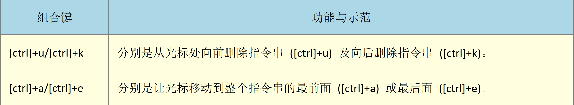 【Tab】接在一串指令的第一个字后面,则为命令补全 【Tab】接在一串指令的第二个字以后,则为文件补全 【Tab】【Tab】