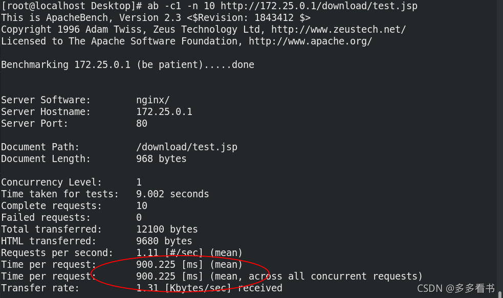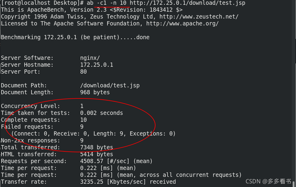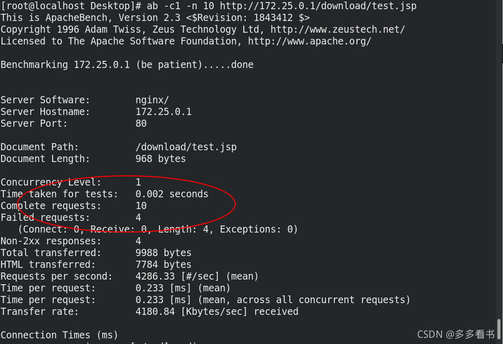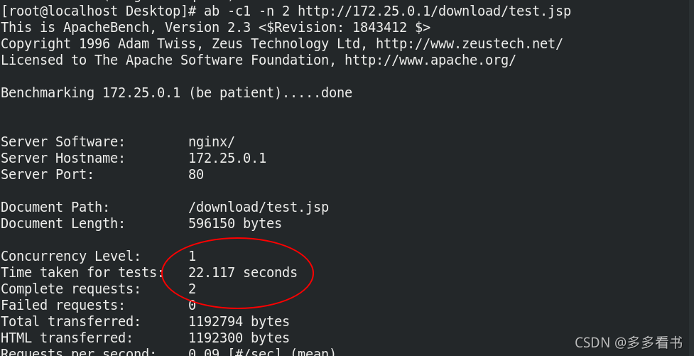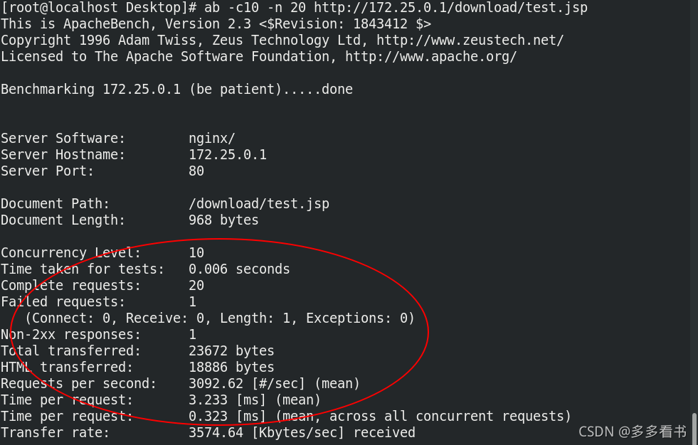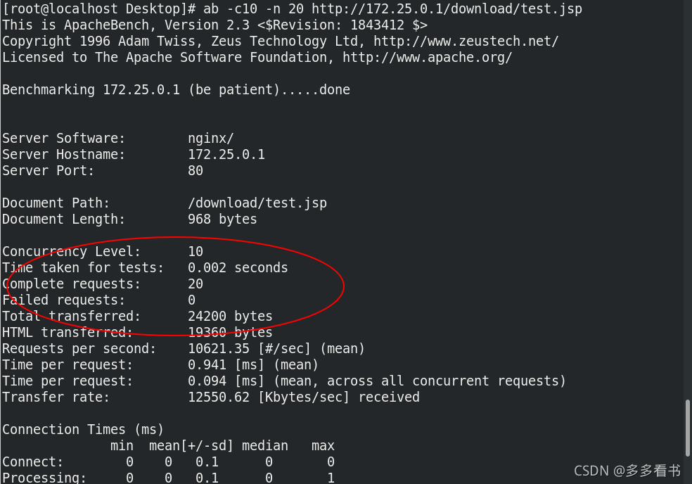 ab -c10 -n 20 http://172.25.0.1/download/test.jsp ##并发数为10,请求总数为20