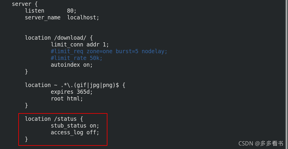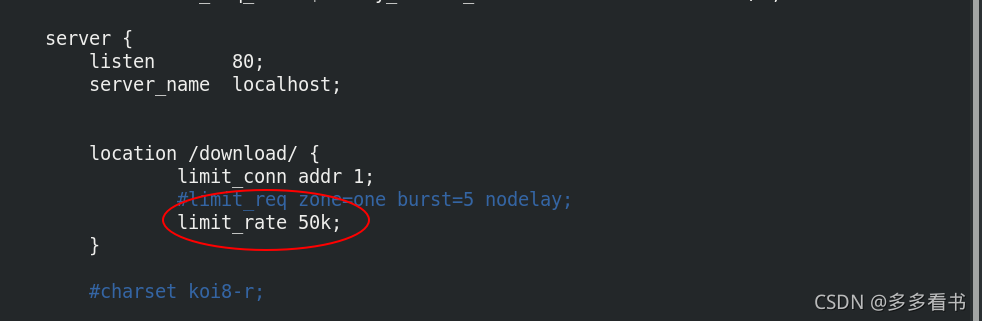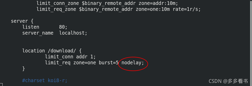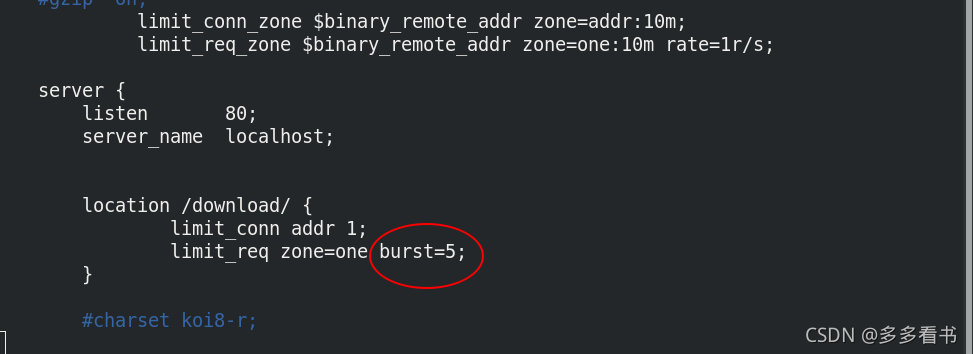 limit_conn_zone $binary_remote_addr zone=addr:10m; ##可以在http的全局写,也可以在某个server的模块里写