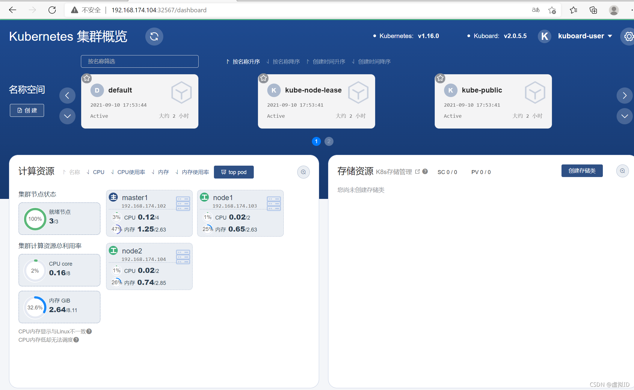 9. 部署 kuboard(建议用)(master) kubectl apply -f https://kuboard.cn/install-script/kuboard.yaml kubectl apply -f https://addons.kuboard.cn/metrics-server/0.3.7/metrics-server.yaml