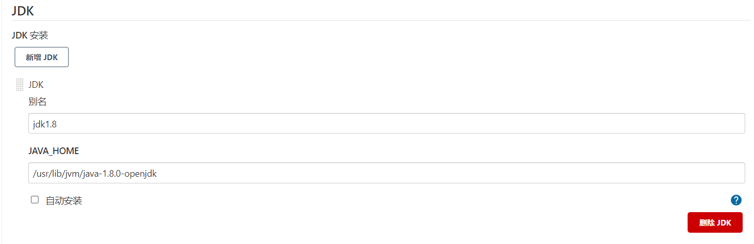 Jenkins->Global Tool Con?guration->JDK->新增JDK,配置如下: 指定JDK的JAVA_HOME即可