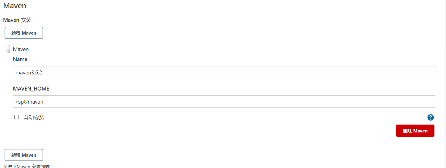 同理指定MAVEN的MAVEM_HOME Jenkins->Global Tool Con?guration->Maven->新增Maven,配置如下: