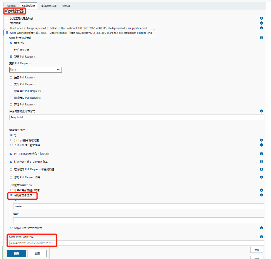 因为我用的是Giee,所以额外安装了Gitee Plugin 插件  随后将上图的url和Gitee WebHook 密码配置到码云的**webHook **中即可
