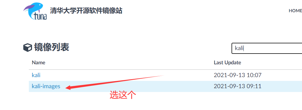 在VMware中安装kali linux1、下载kali linux镜像进入清华镜像官网https://mirrors.tuna.tsinghua.edu.cn/,搜索kali,点击kali-images