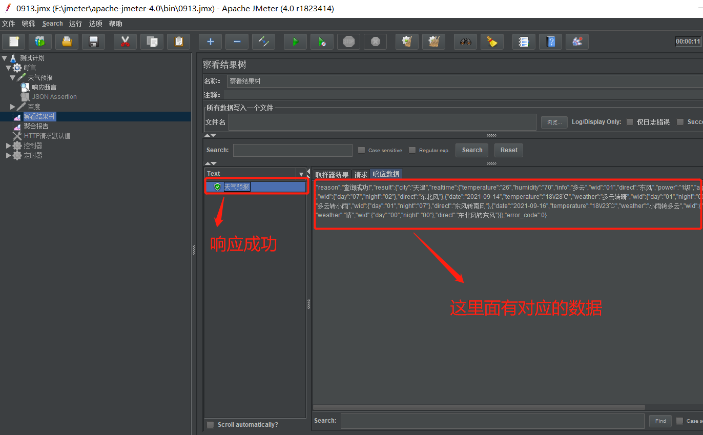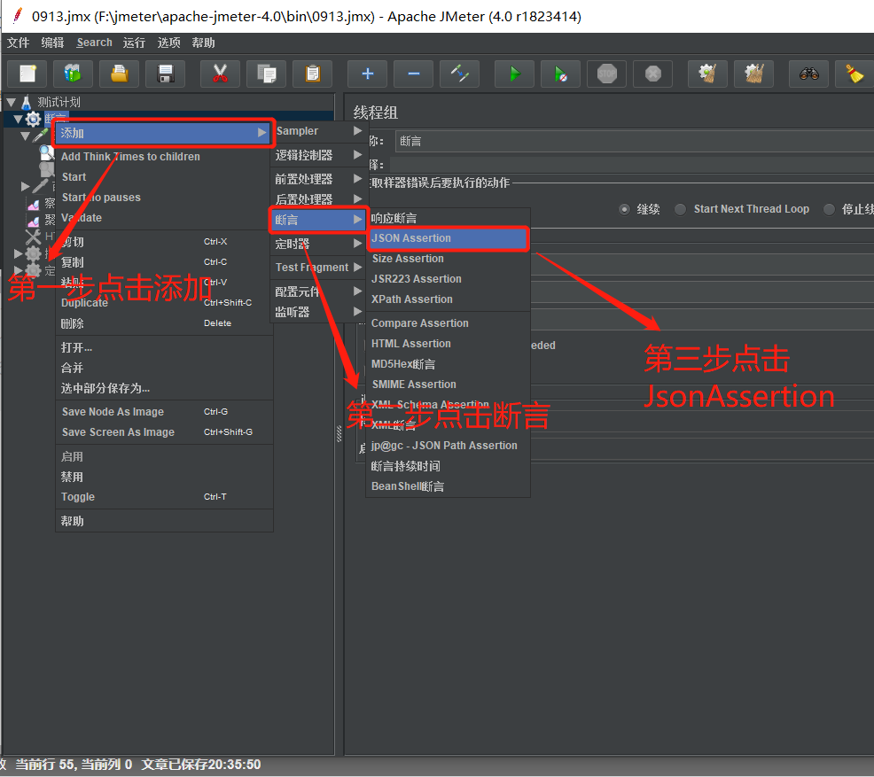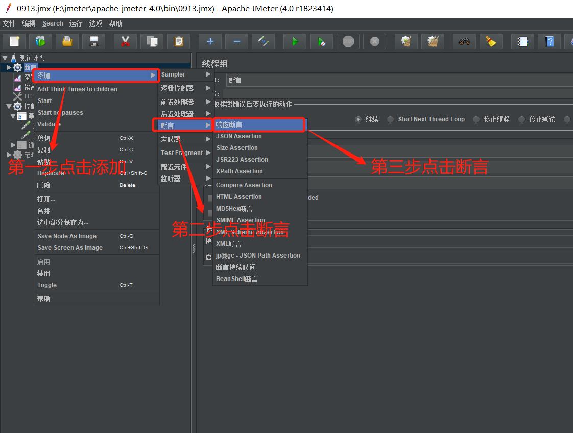 操作:在线程组>>添加>>断言>>响应断言  12.响应断言的使用   13.Json断言的创建