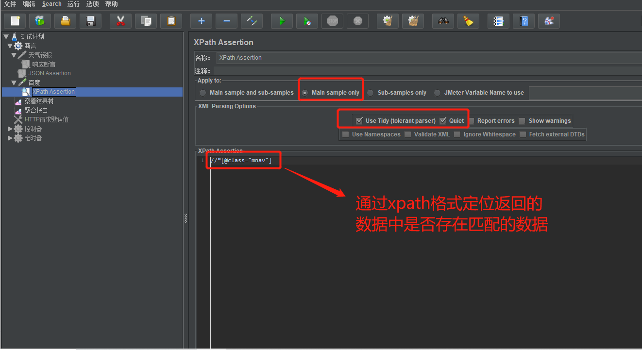 操作:在线程组>>添加>>断言>>xpath断言  16…Xpath断言的使用