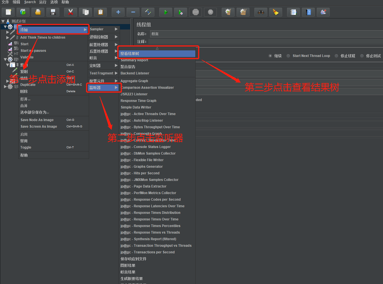 操作:操作:在线程组>>添加>>监听器>>查看结果树  8.查看结果树里的介绍  9.创建聚合报告