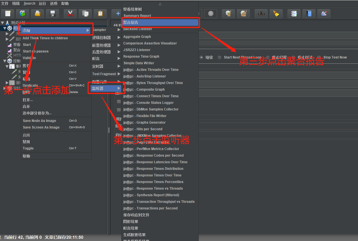 操作:操作:在线程组>>添加>>监听器>>聚合报告  10.聚合报告的介绍  11.响应断言的创建