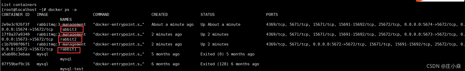 注意:由于Erlang节点间通过认证Erlang cookie的方式来允许互相通信,所以RABBITMQ_ERLANG_COOKIE必须设置为相同的。启动完成之后,使用docker ps命令查看运行情况,确保RabbitMQ都已经启动。