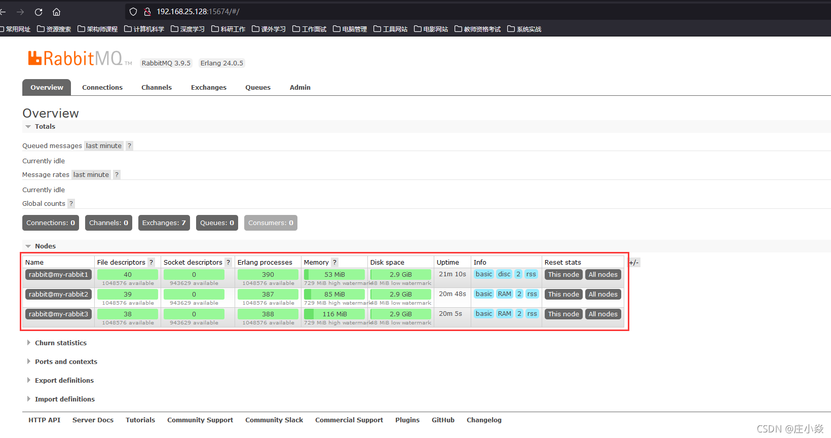 节点设置完成之后,在浏览器访问192.168.25.128:15672、192.168.25.128:15673和192.168.25.128:15674中任意一个,都会看到RabbitMQ集群已经创建成功。