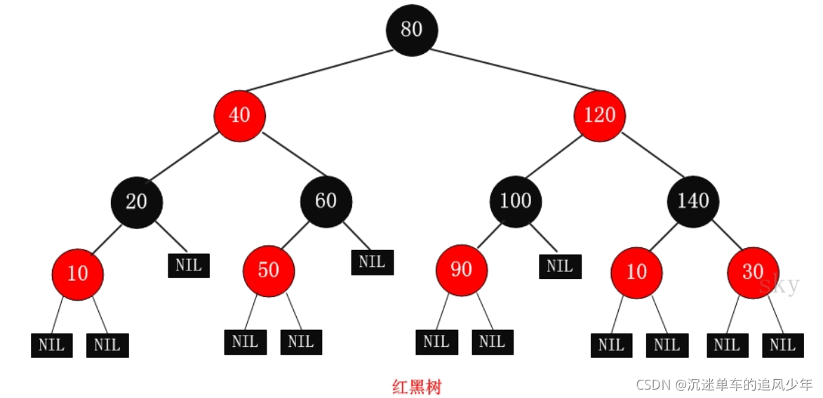 (1)每个节点或者是黑色,或者是红色。 (2)根节点是黑色。 (3)每个叶子节点(NIL)是黑色。 [注意:这里叶子节点,是指为空(NIL或NULL)的叶子节点!] (4)如果一个节点是红色的,则它的子节点必须是黑色的。 (5)从一个节点到该节点的子孙节点的所有路径上包含相同数目的黑节点。