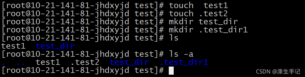 [root@10-21-141-81-jhdxyjd test]# mkdir .test_dir1 #创建一个隐藏目录,以 '.'开头